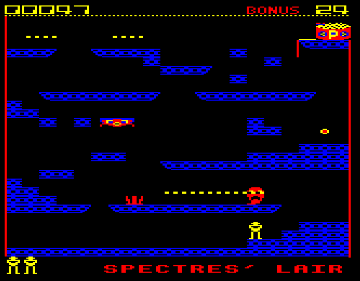Run through the Spectre’s Lair, Horrid Hall, the Spider’s Parlour and Death Tower. Leap over the poison-smeared spikes, scamper along the moving platforms and contracting floorboards, run past bouncing spiders, and use the powerful springs to propel you onto overhanging ledges. Consuming the yellow titbits earns you extra points and eating a stray power jewel causes the ghost(s) to disappear for about 15 seconds.
