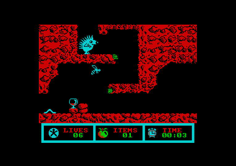 You must help Spiky Harold to prepare for hibernation. Each of the 57 chambers beneath the Hedgerow contains an item of food which Harold can eat. However, he must avoid the creatures who will try to stop him, as well as conkers, sulphur clouds, bouncing balls and peeping periscopes. On his travels, Harold may find some coins which will give him extra lives, and wine glasses that will make him drunk. When you have helped Harold to collect all 57 objects, he must be guided to his home cavern where he can hibernate. BEWARE . . . A sharp frost has been forecast so Harold must have hibernated by the time 24 hours have elapsed, as indicated on the clock, at the bottom of the display.