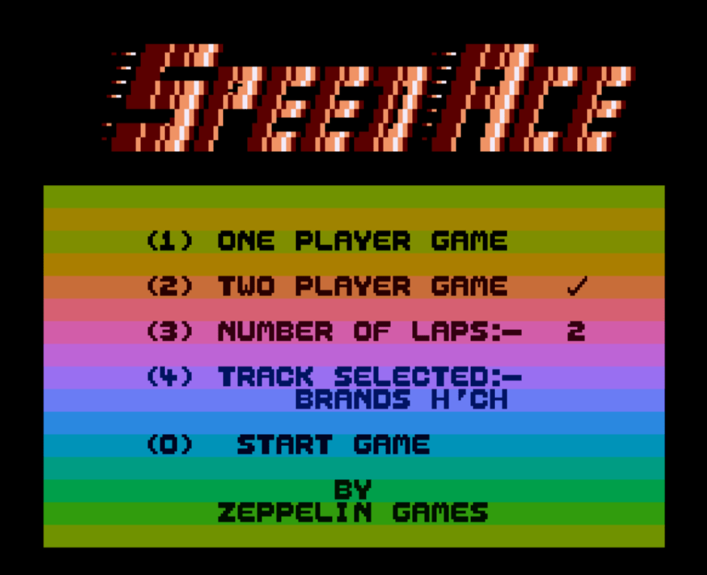 As with most budget releases, Speed Ace is only available on cassette. Being the first release for Zeppelin, they will be hoping for a huge success. When loaded you are presented with the main menu from which to select your race options. If you choose a one player game you will race against 19 other computer-controlled riders on a full screen. The scrolling is very fast and simulated speeds of up to 192 kph are possible. In two player mode you can race against a friend using a joystick plugged into port two.