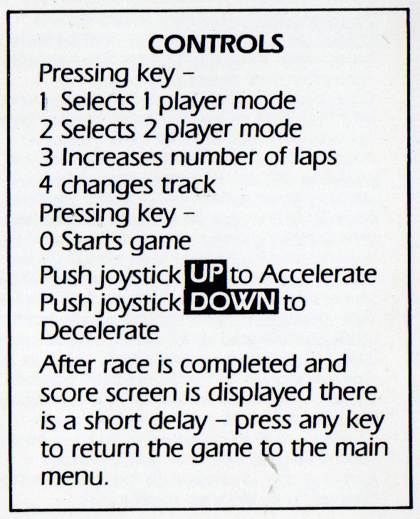 The screen is split into two each half giving an independent view, with the two of you being the only riders. This technique slows the game down a little, but racing against someone other than the computer is great fun. You can choose between nine different race tracks with from one to nine laps on each, The circuits include Brands Hatch, Silverstone, Jarama, Paul Ricard and Daytona.