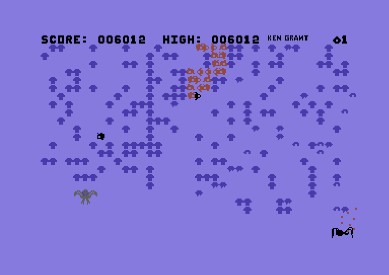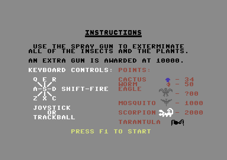 Play Shoot everything that moves, and everything that doesn’t (except the spider). Follow the instructions on the screen to enter number of players etc. Extra men are awarded and the game speeds up as you proceed. F5 will turn the sound on and off. F7 will freeze and unfreeze the action. Restore key will restart game.