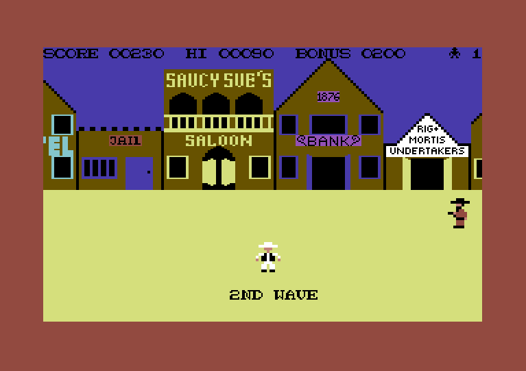 Latter day Garry Coopers will be in their element, yet others will find that the cassette case gathers dust after the novelty wears off. This is not a run of the mill shoot out: the graphics are 30, so you may move anywhere on Main Street slinging the lead about. As you mosey on out of the jail house the outlaws amble into town: shots are fired in any of the standard eight directions.