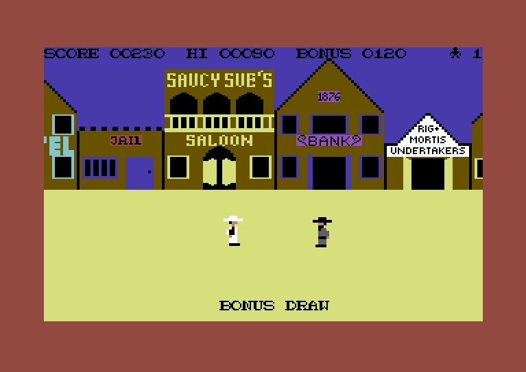 Latter day Garry Coopers will be in their element, yet others will find that the cassette case gathers dust after the novelty wears off. This is not a run of the mill shoot out: the graphics are 30, so you may move anywhere on Main Street slinging the lead about. As you mosey on out of the jail house the outlaws amble into town: shots are fired in any of the standard eight directions.
