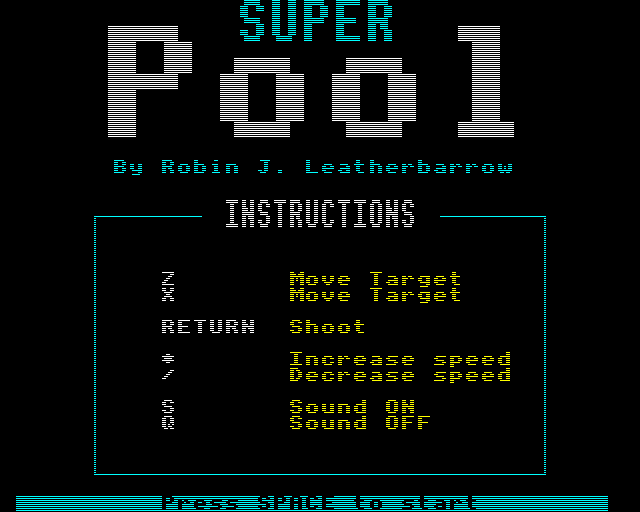 Although not quite in the style or atmosphere of the Crucible Theatre, the game represents a pretty accurate simulation of a game of pool, with six balls, coloured and numbered, and a plan view of a pool table. All these go to make an attractive and uncomplicated display, with the scoreboard along the top edge of your screen. You sight your cue ball by moving an indicator along the cushion, and this is where the ball will strike, provided, of course, that there is not a ball in between, which in fact is your aim. You select the strength of your shot, press Fire and, if you’re like me, the white ball then goes into a pocket.