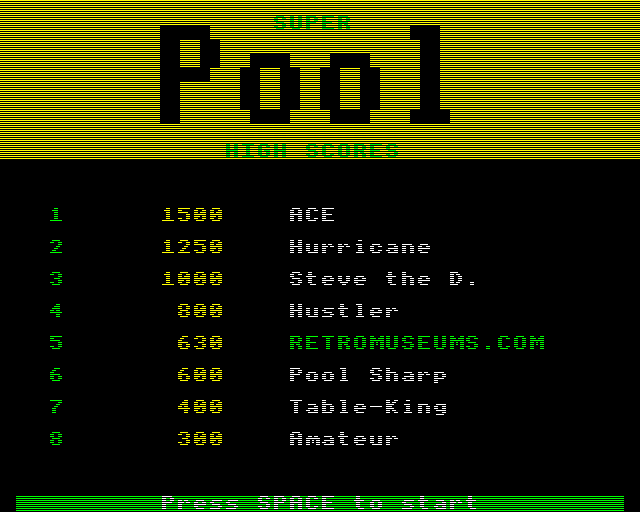 A straightforward Pool game, we all know the rules. And for 8bit graphical experiences a Pool game is well enough with what the 8bit machines offer.